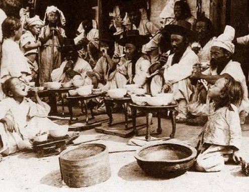 Note that all the cloths they wear are white. They were so poor that they were unable to buy or import dyes/pigments for dyeing. Only the court aristocrats could wear dyed cloths.