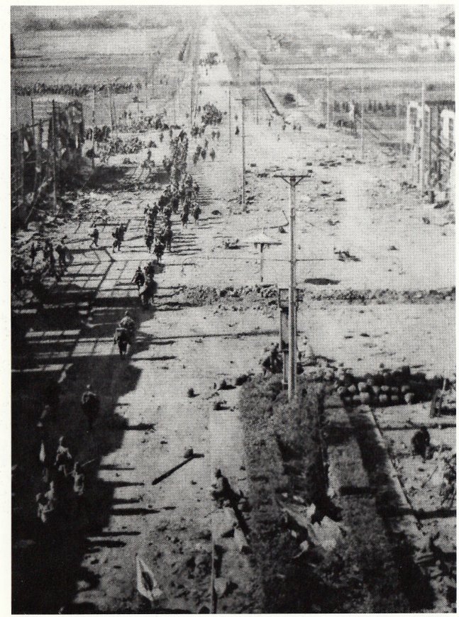 | A view from the top of the Chungshang Gate just after the battle (Source: Asahi-graph No. 11). After occupying the gate, the Japanese Army advances on the Chungshang East Road. This photo is consistent with the above description that inhabitants were rare in the eastern side of the Nanking City. |